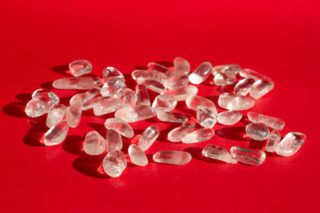 Samples of natural mineral from geological collection - rolled colorless Rock crystal gem stone on red background Narrow focus line, shallow depth of field front view front view