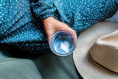 Close-up of a womans hand holding a cold glass of water and ice over a white background.