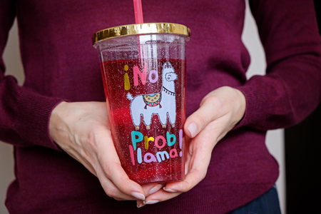 Teen girl holding glass with straw with purple drink in hand. Female quenching thirst on sunny summer day, sky background, copy space