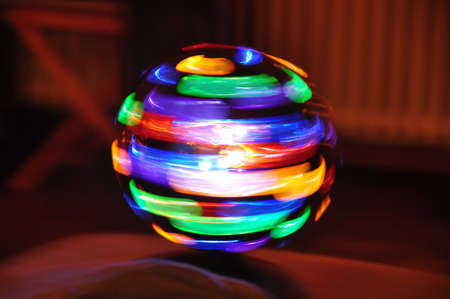 A metallic spinning top rotates rapidly, creating beautiful reflections and patterns in a dimly lit setting.