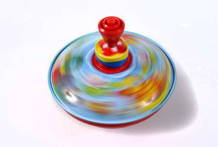Plastic spinning top toy isolated on the reclaimed oak surface