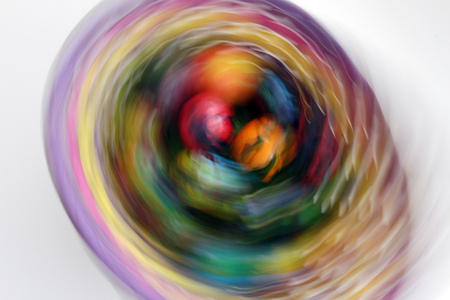 Easter eggs. Photo in motion effects during shooting. Not post process. Handmade painted eggs in basket for Easter celebration isolated on white background. Easter. Colored Easter eggs.
