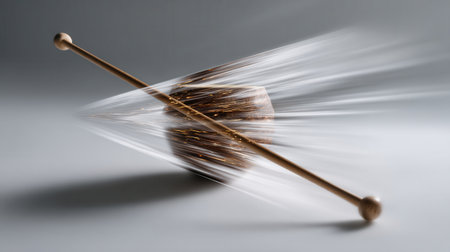 A beautifully handcrafted spinning top spins gently on a wooden table. The warm sunlight filters through, casting intricate shadows as the top dances.