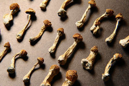 Close up Magic shroom. Psychedelic drug. Dry Psilocybe cubensis. Albino A strain. Psilocybin Mushroom. Psilocybin mushroom.