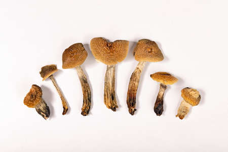 Psychedelic drug. Psilocybin Mushroom. Albino A strain. White background. Psilocybin mushroom. Close up Magic shroom. Dry Psilocybe cubensis.