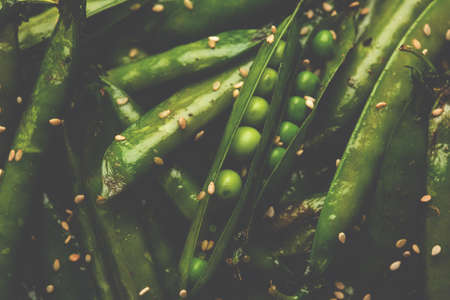 Vegetable backdrop vith copy space for your projects. Close up of fresh ripe green peas on black background