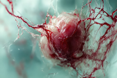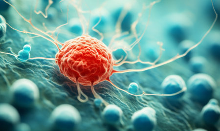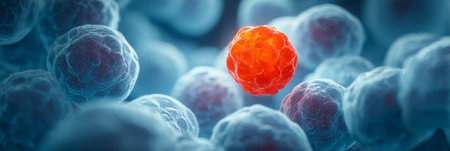 Stunning macro imagery that captures the fascinating details of cancer cells within a dynamic environment, showing their complex structure and unique characteristics