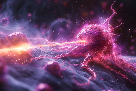 Visual representation of a cancer cell interacting with an energy surge, showcasing vibrant colors and dynamic movement. Concept of medical research, biotechnology, healthcare advancements.