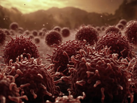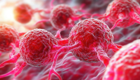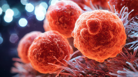 Stunning macro imagery that captures the fascinating details of cancer cells within a dynamic environment, showing their complex structure and unique characteristics