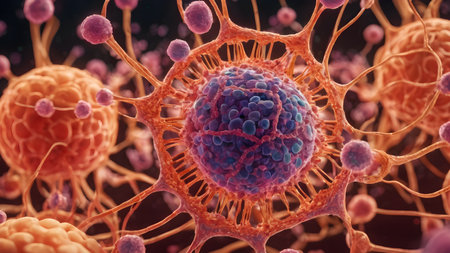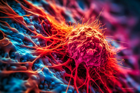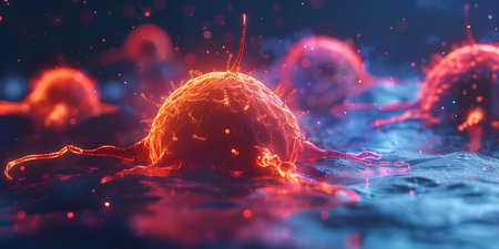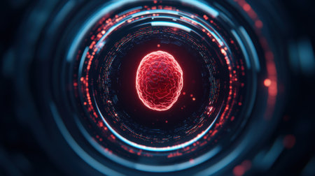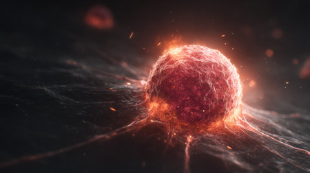 A vividly illuminated cell appears to pulse with life, surrounded by a dark background that highlights its intricate surface texture and vibrant colors.