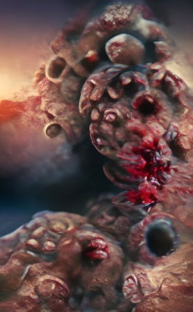 Cancer cell growth uncontrollably over tissue, Tumor infection cells and spreading, Invasive inflammation and cancerous metastasis. reproduce by duplicating, cells expanding, Dise