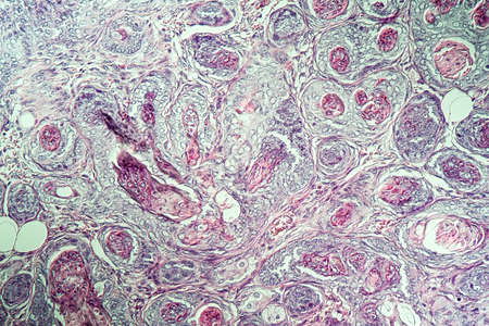 Light micrograph of teratoma, a tumor made up of several different types of tissue, such as hair, teeth, muscle, or bone. Teratoma is typically found in the ovary, testicle, or coccyx