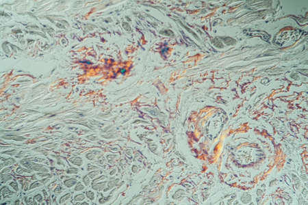 hearth with amyloid deposits of sick tissue under the microscope 200x