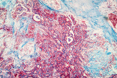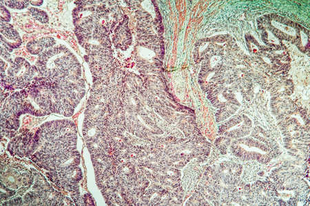 Ovarian cancer, light micrograph, photo under microscope. Photograph shows a fragment of a cancerous tumor in the female ovary. Selective focus