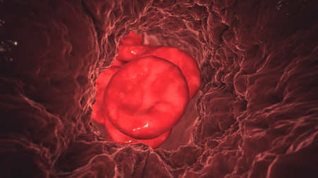 Vasoconstriction, clot formation in blood vessel. Erythrocytes flowing through narrowing blood vessel, 3D illustration
