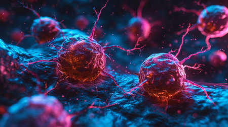 Visual representation of a cancer cell interacting with an energy surge, showcasing vibrant colors and dynamic movement. Concept of medical research, biotechnology, healthcare advancements.