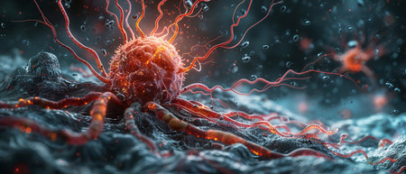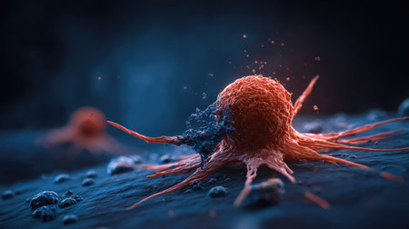 A close-up illustration depicts a cancer cell with spiky extensions in shades of orange and blue. The cell is set against a dark, textured background suggesting a biological environment. The image uses a high level of detail and is likely created digitally. Potential uses include educational resources and scientific visualizations.