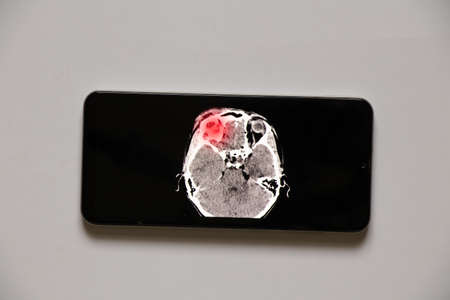 3D computed tomography of the brain with a fracture of the frontal part of the skull after injury on phone screens, mobile application