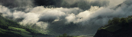 Mountain forest and clouds. Summer panoramic landscape