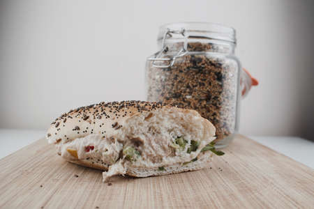 Tasty sandwich roll with a seeds, tuna, vegetables and salad near jar with seeds.