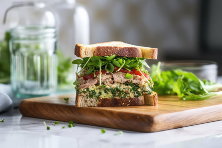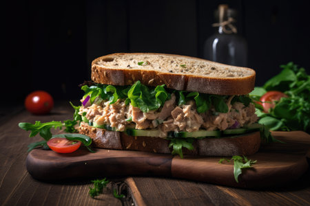 a sandwich with tuna salad and fresh greens on whole wheat bread, created with generative ai