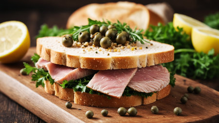 Tuna sandwich with vibrant green herbs and zesty lemon wedges on a wooden surface, ready for serving. Concept of fresh, homemade, and delicious cooking.