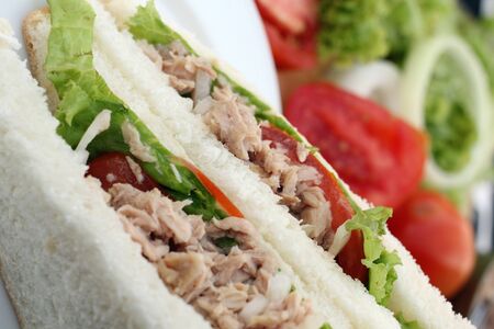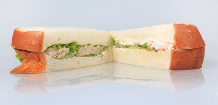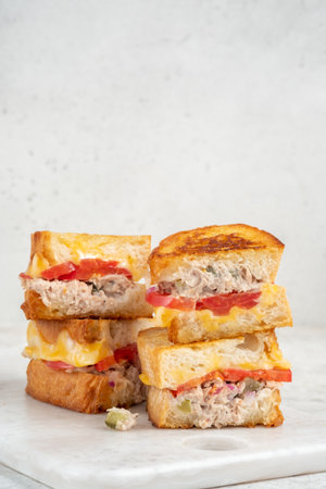 Tuna Sandwich with Lettuce, Tomato and Cheese on White Marble Background.