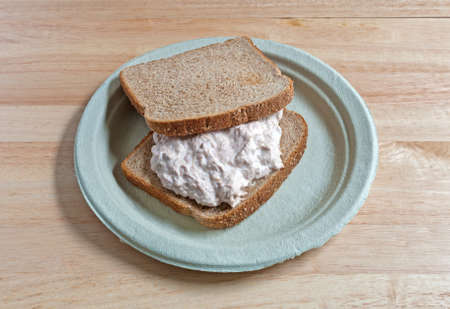 A freshly made tuna sandwich on whole wheat bread on a paper plate atop a wood table.