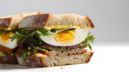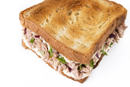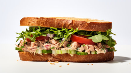 Close-up realistic photo featuring a hearty tuna salad sandwich on a white background Generative AI