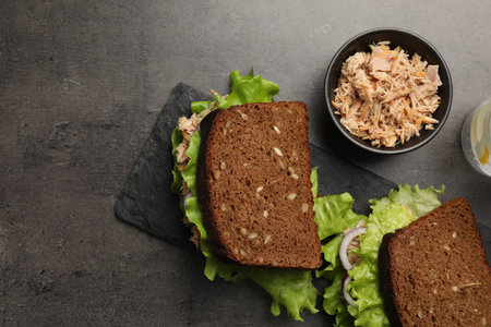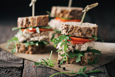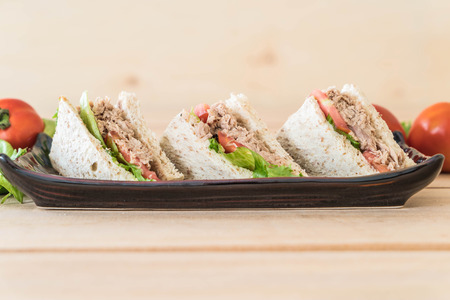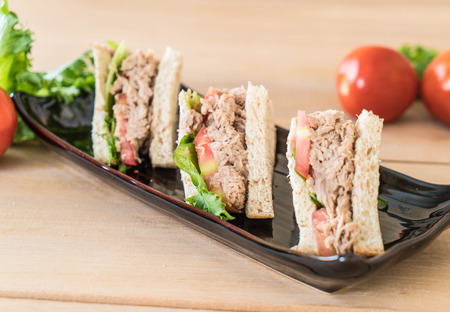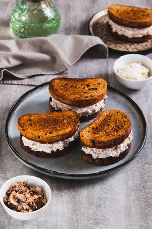Tuna sandwich with whole wheat bread, healthy food, black food, on a rustic background.