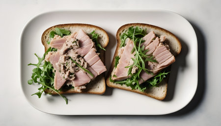 tuna sandwich on rye bread with lettuce, viewed from above, created with generative ai