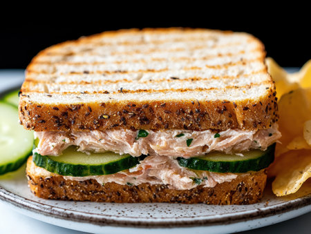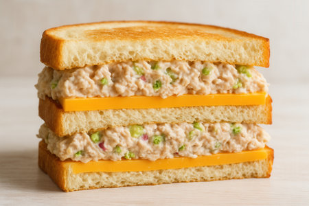 Stacked Tuna Salad And Cheddar Sandwich On Toasted Bread With Hearty Filling