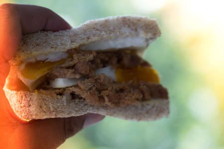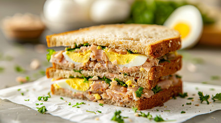 A delicious sandwich made with whole grain bread, filled with tuna, boiled eggs, and fresh herbs. The sandwich is garnished with parsley and served on a light background.