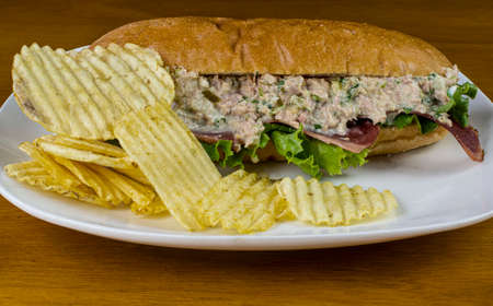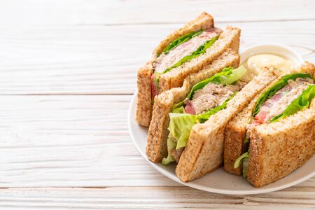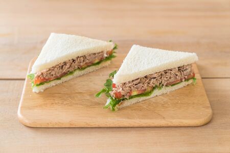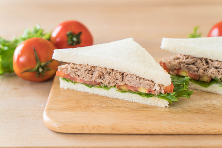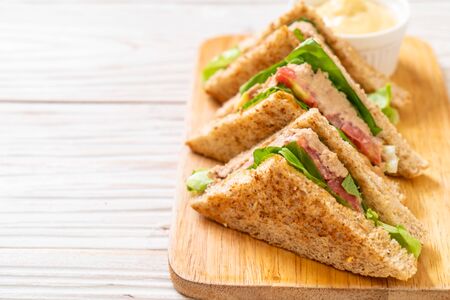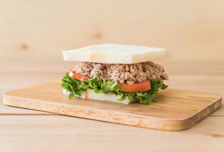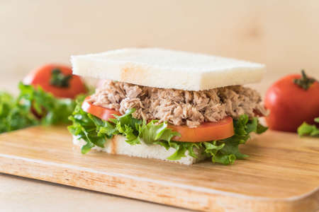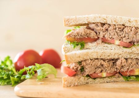 Delicious tuna sandwich, served with lettuce, tomato and onion. Natural wood in the background. Front view.