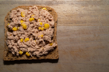 Toasted whole wheat bread with tuna and sweetcorn and copy space to the right