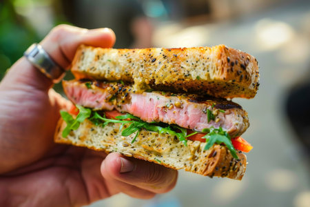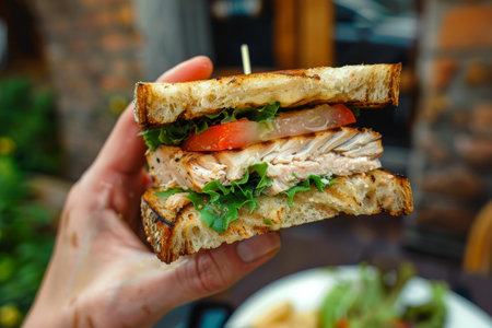 Delicious grilled tuna steak sandwich held in hand, perfect summer barbecue meal