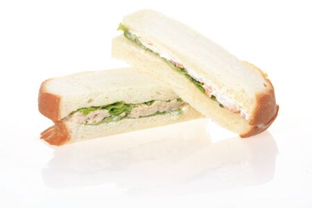 Tuna Salad Sandwich with Cheese, lettuce and herbs. white background. top view.