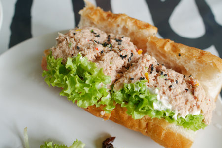 Tasty Tuna Fish Bread Sandwich on White Paper Background - AR 3:2