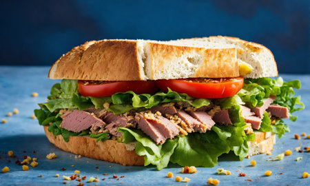 tuna salad sandwich with crispy bread, juicy tomatoes and crunchy lettuce, created with generative ai