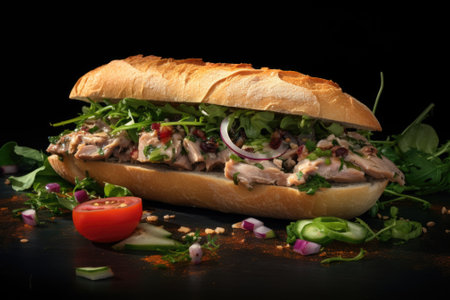 tuna salad sandwich, overflowing with toppings and ingredients, created with generative ai