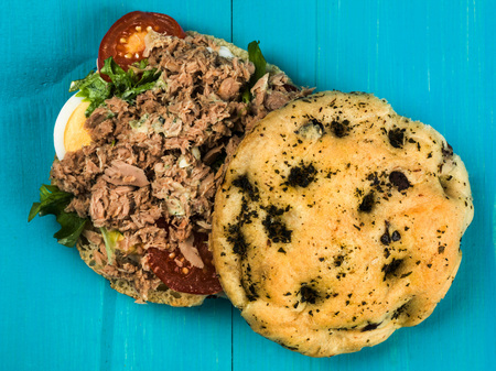 Tuna Nicoise Salad In a Focaccia Bread Bun Against a Blue Background