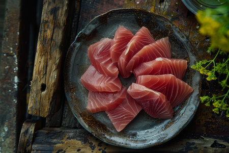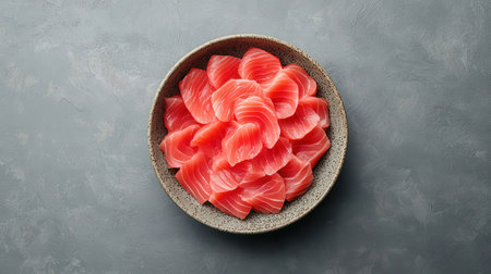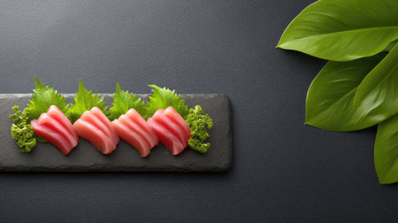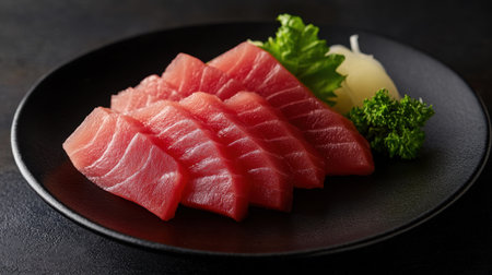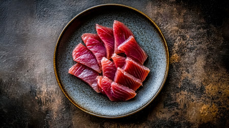 Vibrant tuna sashimi arranged on a plate, showcasing its rich color and delicate texture for an exquisite meal. black background. top view.