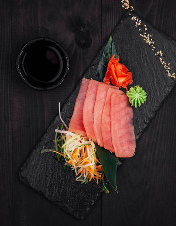 Sashimi tuna is served on a black stone with soy sauce, ginger, wasabi and vegetable salad on a wooden table