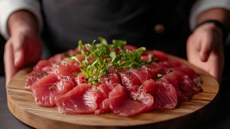 Chef preparation of fresh tuna raw sashimi. Japanese food style