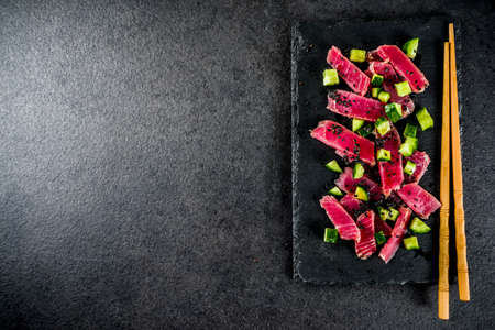 Tuna sashimi poke with raw fresh fish, cucumber, black sesame seeds and soy sauce, black stone background copy space
