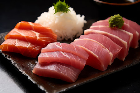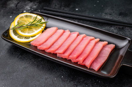 Premium quality tuna sashimi, expertly cut for maximum tenderness and taste, perfect for sushi enthusiasts. black background. top view.