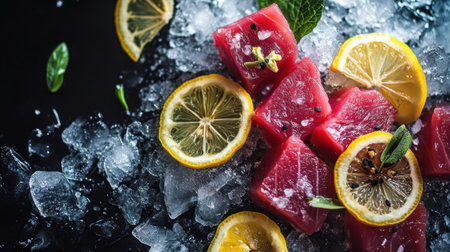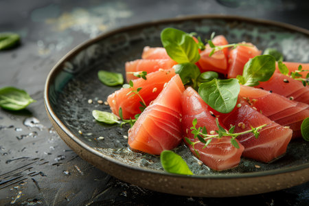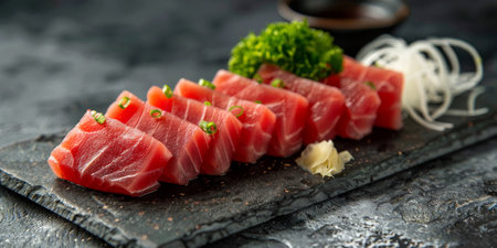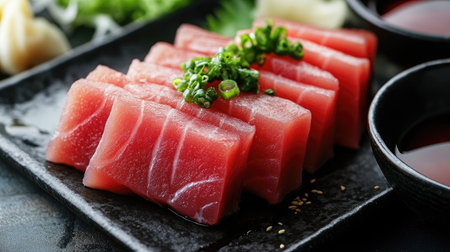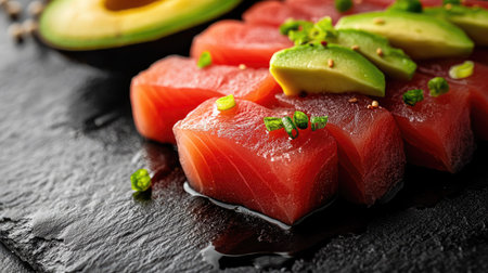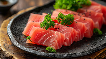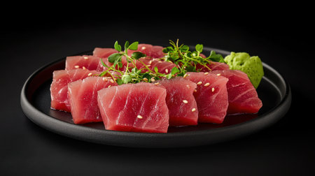 Premium quality tuna sashimi, ideal for a refreshing appetizer or light meal that delights the senses. black background. top view.