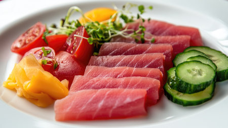 Premium quality tuna sashimi, ideal for a refreshing appetizer or light meal that delights the senses. Isolated on white background. Top view.