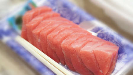 Tuna sashimi. Otoro sashimi ready to eat on plate from famous shop in supermarket Osaka Japan. Best part of Tuna is called Otoro which come from tuna fatty belly. Very popular menu for sushi lovers.
