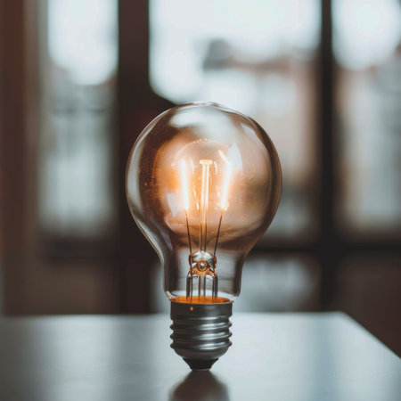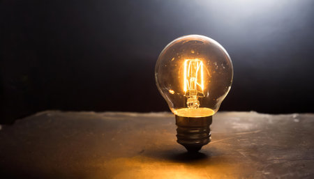 A light bulb is lit up and is sitting on a table. The light bulb is glowing and casting a warm, inviting light. Concept of comfort and relaxation, as if the light bulb is a source of warmth